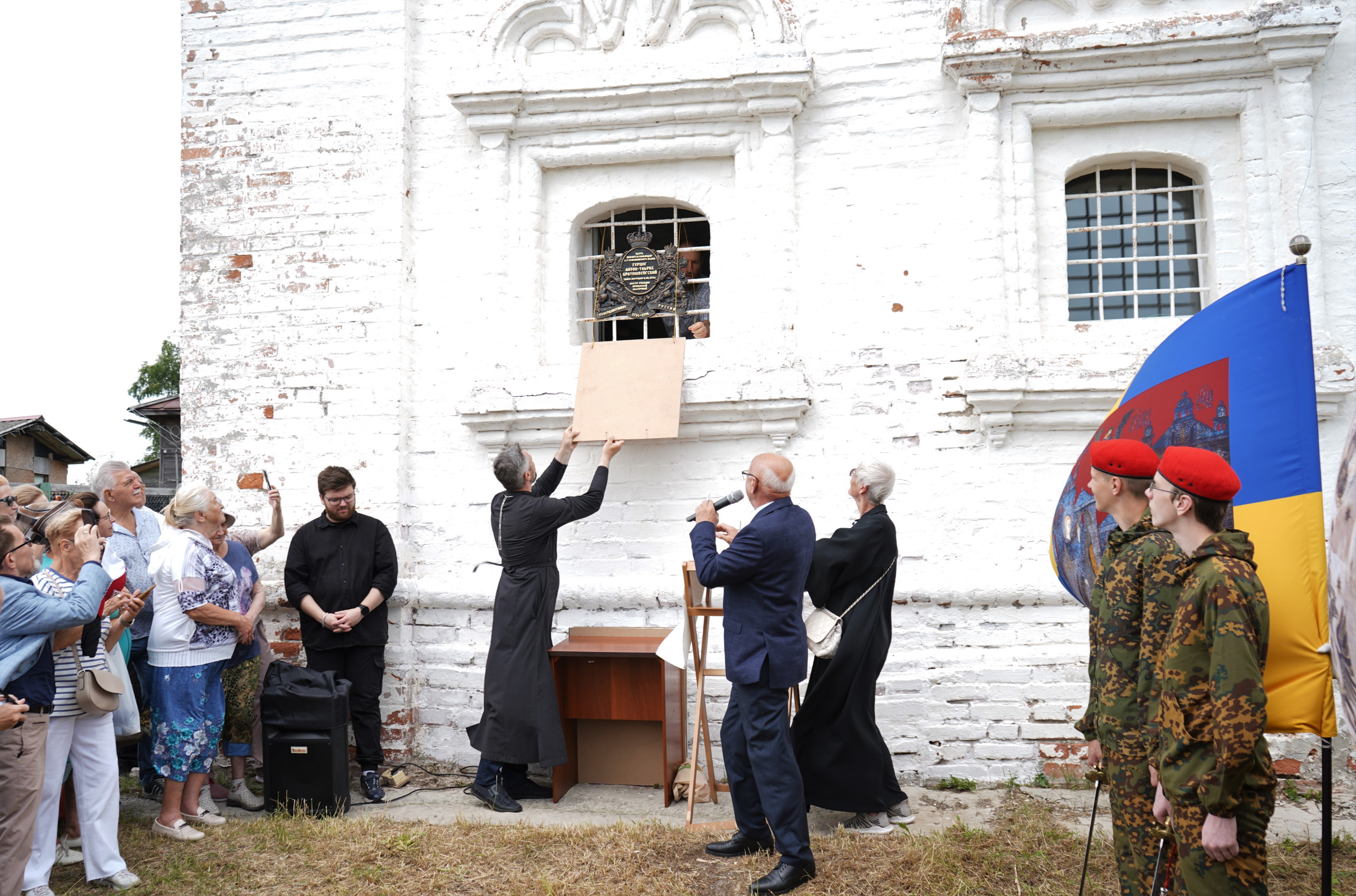 Это событие стало возможным благодаря исследовательской деятельности одного из выпускников 1972 года А.Ф. Каранина, к.м.н., доцента, лауреата премии им. М.В. Ломоносова. Анатолий Феодосьевич возглавлял поисковую группу, которая 14 лет назад обнаружила предположительное захоронение Ивана VI, а в прошлом году, спустя 13 лет, – место погребения его отца. Согласно выводам исследователей, последний земной приют Антона Ульриха находится под окнами архиерейских палат, где в заточении содержалось семейство Брауншвейгских. На одном из окон здания и был установлен памятный знак, разработанный А.Ф. Караниным на основе малого герба Брауншвейгского рода. В 2024 году в издательстве СГМУ вышла книга Анатолия Феодосьевича «Каждый ветер ищет свой парус», посвященная увлекательной истории проведенных исследований. Выпускники лечебного факультета, приехавшие в Холмогоры из различных регионов нашей необъятной страны и даже зарубежья, получил издание в подарок.