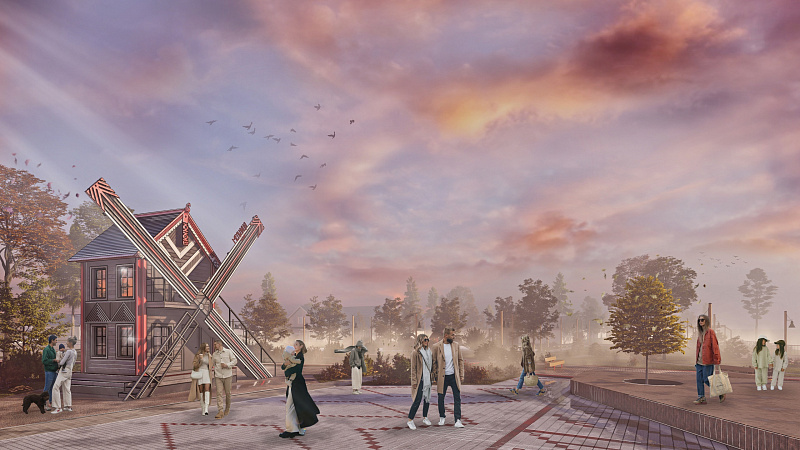 Инициатива Мезени предусматривает устройство детской площадки, веревочного парка и деревянной набережной. Зону массовых мероприятий украсит кафе в виде мельницы со смотровой площадкой.