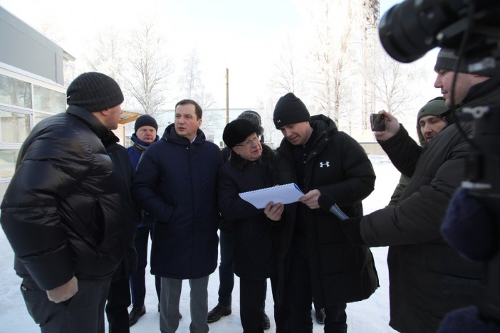 Губернатор Александр Цыбульский и глава Северодвинска Игорь Арсентьев оценили темпы возведения крытой ледовой арены на стадионе «Север».
