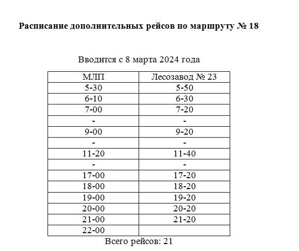 В связи с закрытием пешеходной ледовой переправы Лесозавод № 22 - Лесозавод № 23 с 0:00 8 марта будет организована работа дополнительного автобуса МЛП - Лесозавод № 23 ежедневно по расписанию 21 рейс.