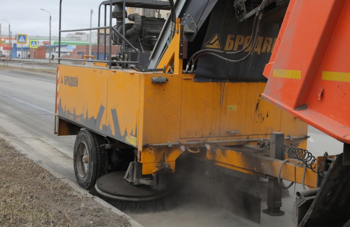 Подметально-уборочную машину (ПУМ) вывел подрядчик для уборки городских дорог.
