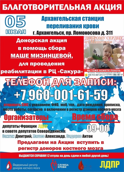 Организаторами акции, которая состоится 5 июня на базе Архангельской областной станции переливания крови, выступили депутаты фракции ЛДПР в Северодвинском горсовете Дмитрий Зангин, Александр Пашев и Антон Сидоров.
