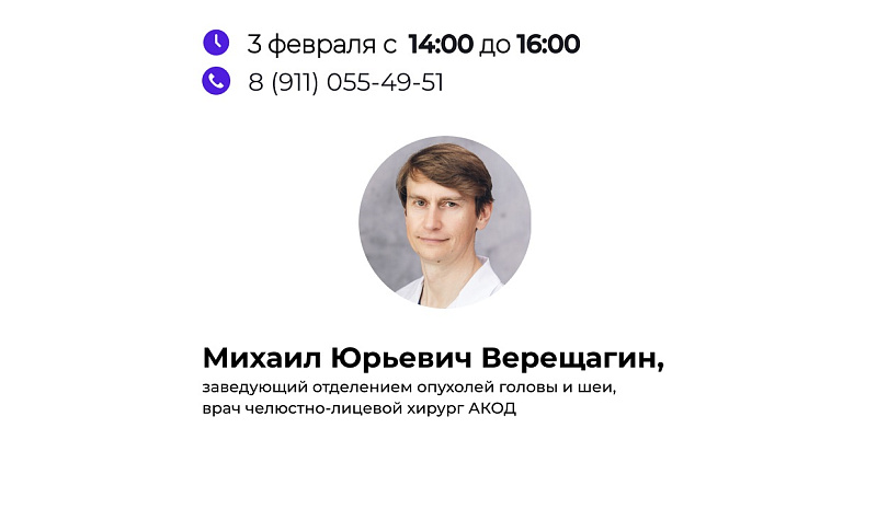 В субботу, 3 февраля, по телефону 8-911-055-4951 с 14:00 до 16:00 консультации проведет хирург Архангельского онкологического диспансера Михаил Верещагин.