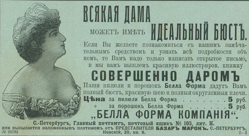 «Всякая дама может иметь идеальный бюст», - говорит объявление о препарате для увеличения груди (насколько он реально работал - история умалчивает).